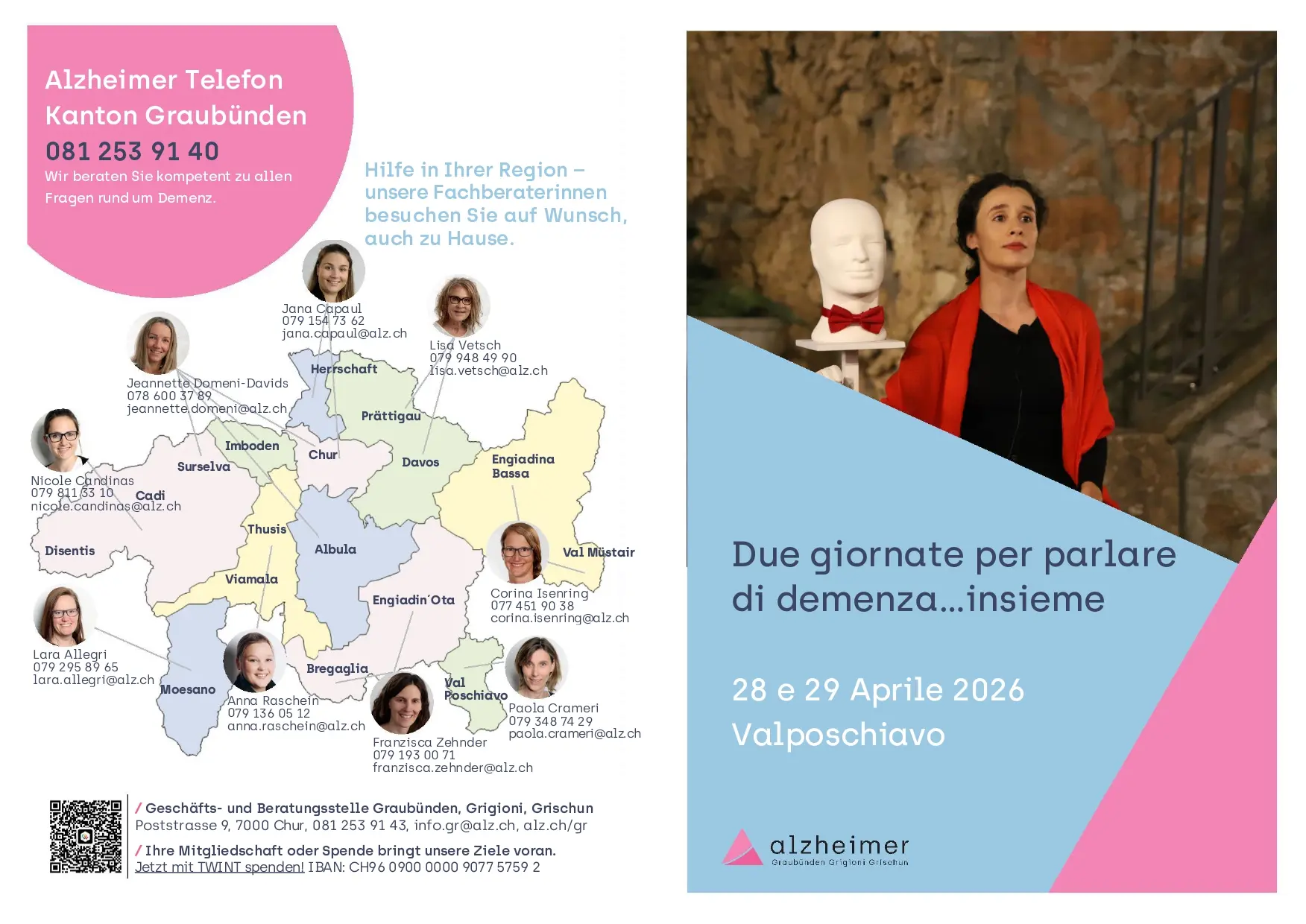 Il 28 e 29 aprile Alzheimer Grigioni porta in Valposchiavo due appuntamenti sulla demenza: una serata teatrale al Centro Parrocchiale di Poschiavo e un infomobil itinerante tra Brusio e Poschiavo. Un’occasione per informare e rafforzare la rete di sostegno locale.