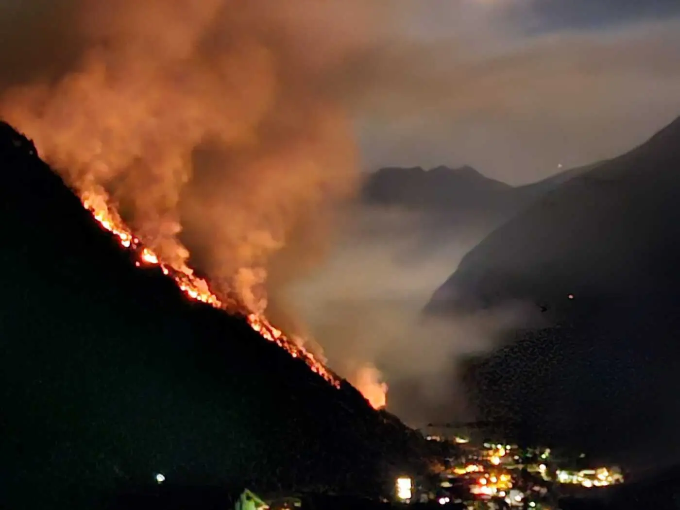 Un incendio boschivo che brucia lungo una montagna di notte, con fiamme e fumi visibili che si alzano contro il cielo scuro. In basso, una valle illumin