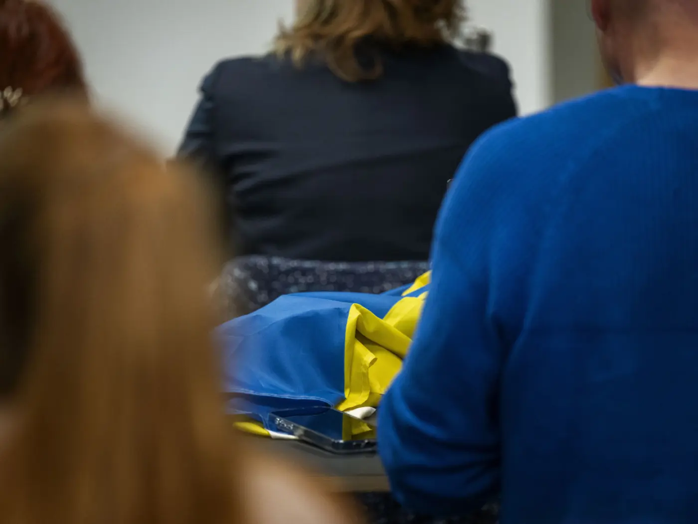 Persone sedute a una tavola, con uno zaino blu e giallo visibile in primo piano. Sono presenti anche capelli rossi e una giacca scura.