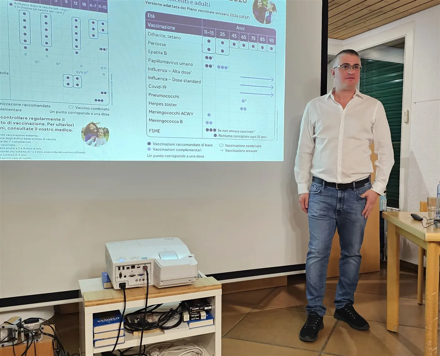 Il CSVP ha organizzato una serata sui vaccini alla Casa Anziani. Il Dr. med. Claudio De Bernardi ha illustrato storia, efficacia e tipologie di vaccinazioni. Grande affluenza per contrastare la disinformazione e chiarire dubbi scientifici nella comunità.