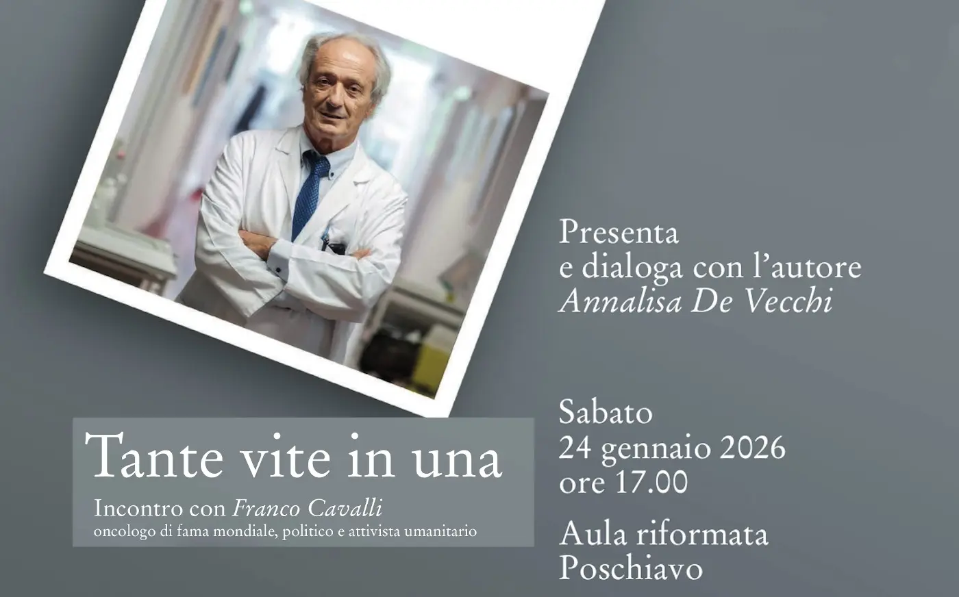 Franco Cavalli, “Tante vite in una Autobiografia di un militante tra medicina e politica” - Venerdí 24 gennaio 2026, ore 17.00 – Aula riformata, Poschiavo. Presenta il volume e dialoga con l’autore Annalisa De Vecchi.