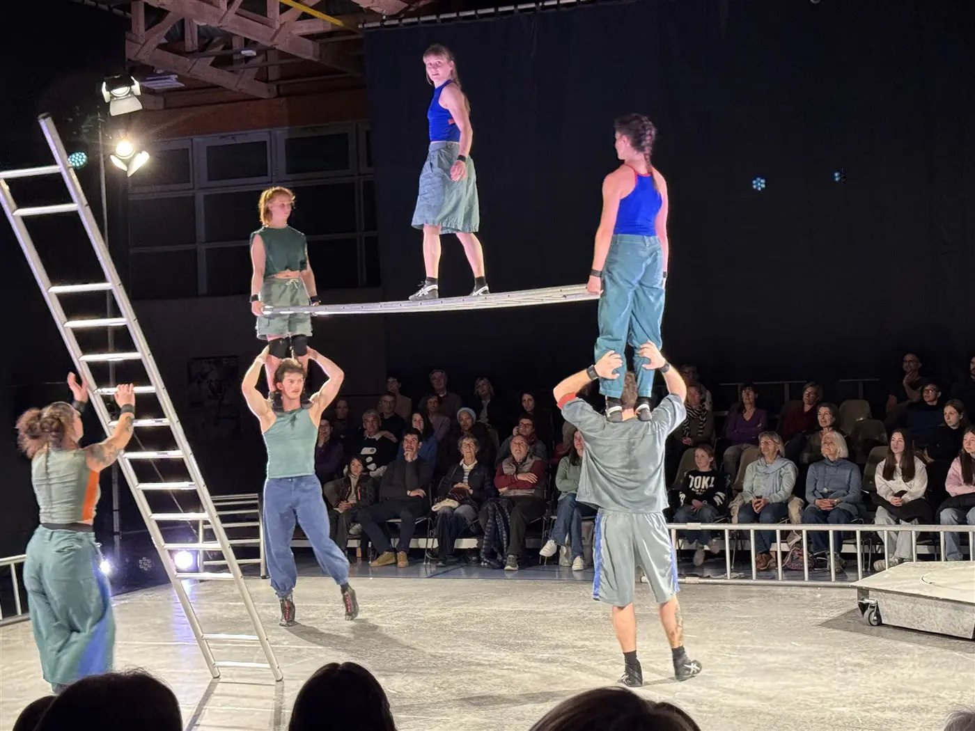 Nel fine settimana il Festival Steps ha portato a Poschiavo "Beyond" della compagnia belga Circumstances. Tra acrobazie e danza, gli artisti trasformano scale metalliche in partner viventi. Uno spettacolo sul rischio e la fiducia che ha coinvolto oltre 200 spettatori.