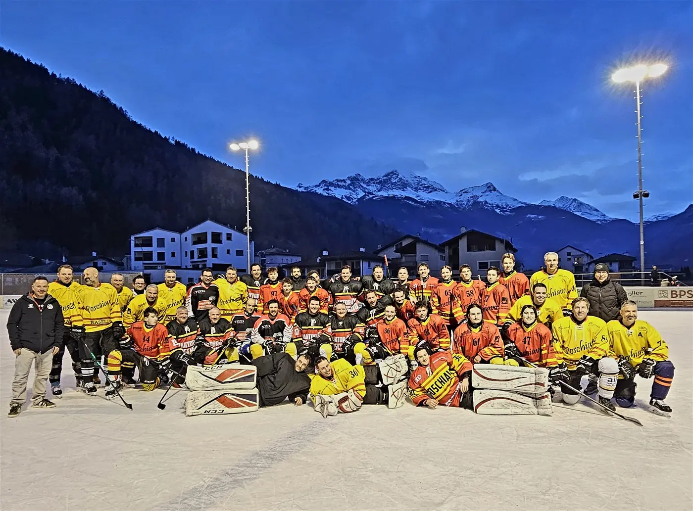 Un gruppo di giocatori di hockey su ghiaccio in uniforme, posano insieme sul campo illuminato. Sullo sfondo si vedono montagne e un cielo blu crepuscolare.